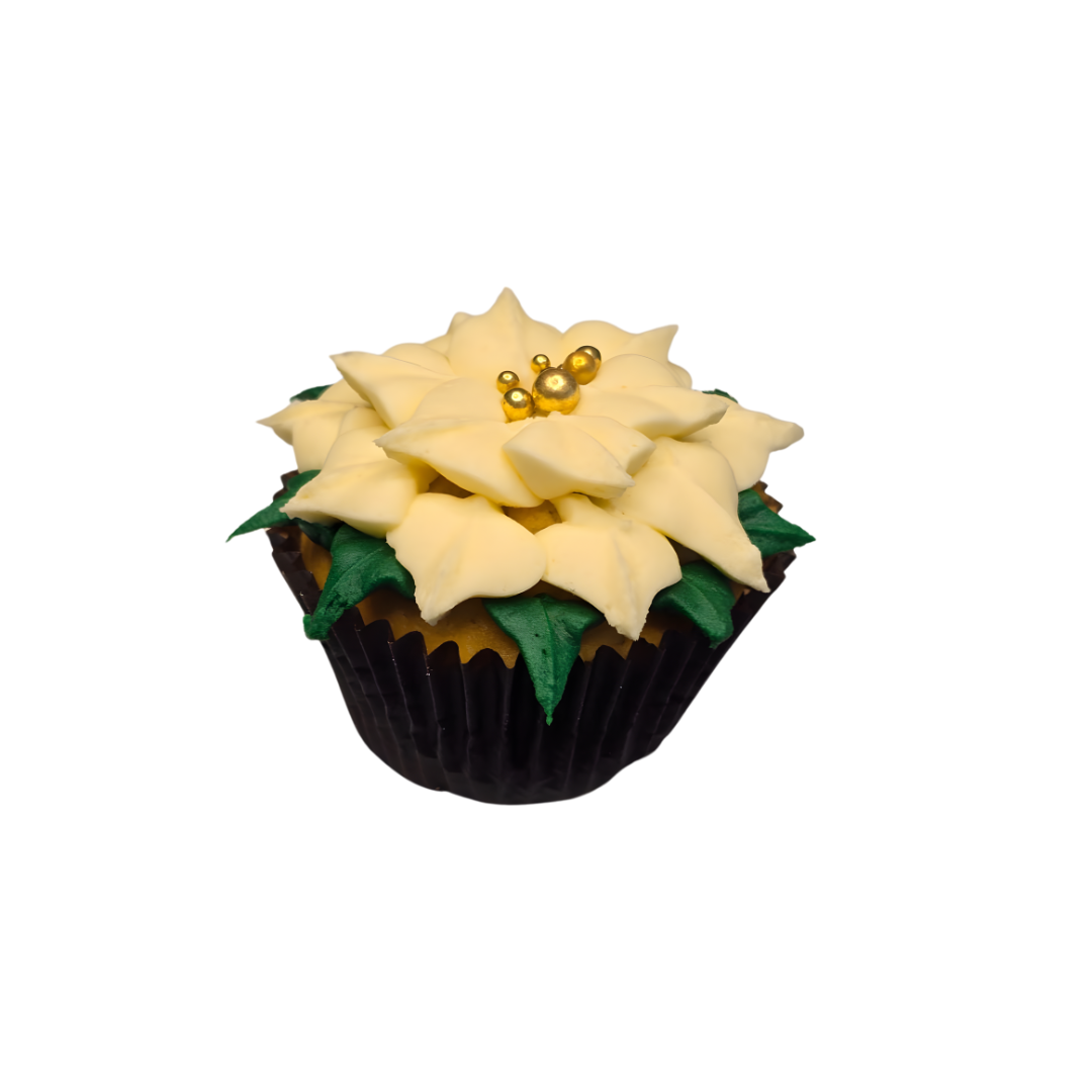 Elegant, soft and perfectly festive – our White Poinsettia cupcake is topped with a hand-piped buttercream poinsettia in creamy ivory, finished with golden pearls and deep green leaves. It’s the classy Christmas cupcake that looks stunning on any dessert table.