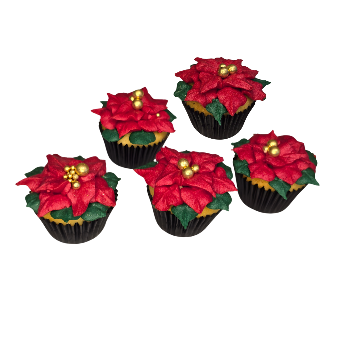 Each bite-sized beauty is topped with a hand-piped buttercream poinsettia in vibrant red and green, finished with tiny golden pearls for a touch of festive sparkle.