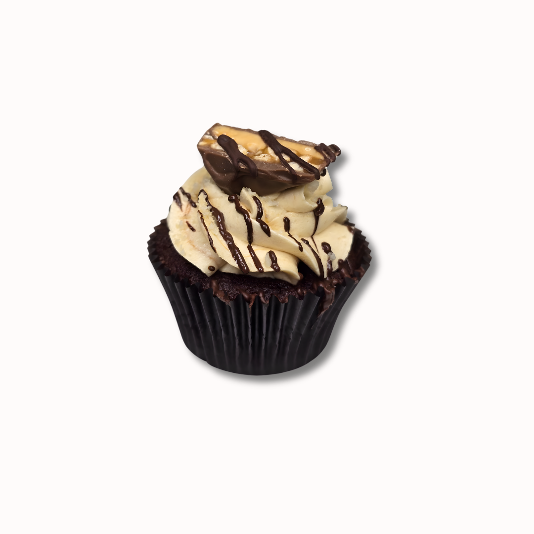 This cupcake features a moist chocolate base topped with a generous swirl of silky buttercream, finished with a piece of Snickers chocolate and a drizzle of rich chocolate sauce. Every bite delivers a satisfying balance of chocolate, caramel sweetness, and nutty crunch — perfect for anyone who loves bold, indulgent flavours.